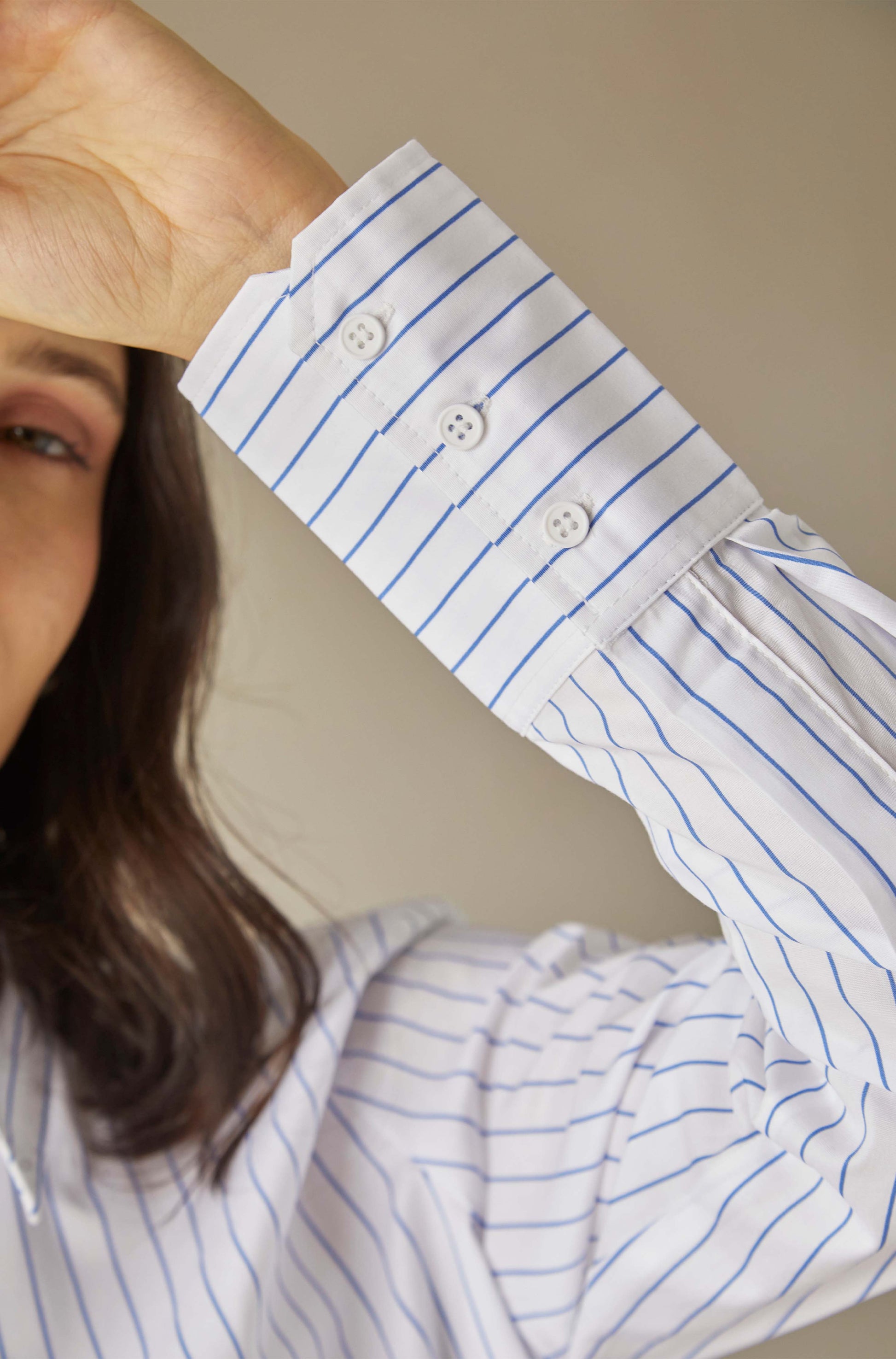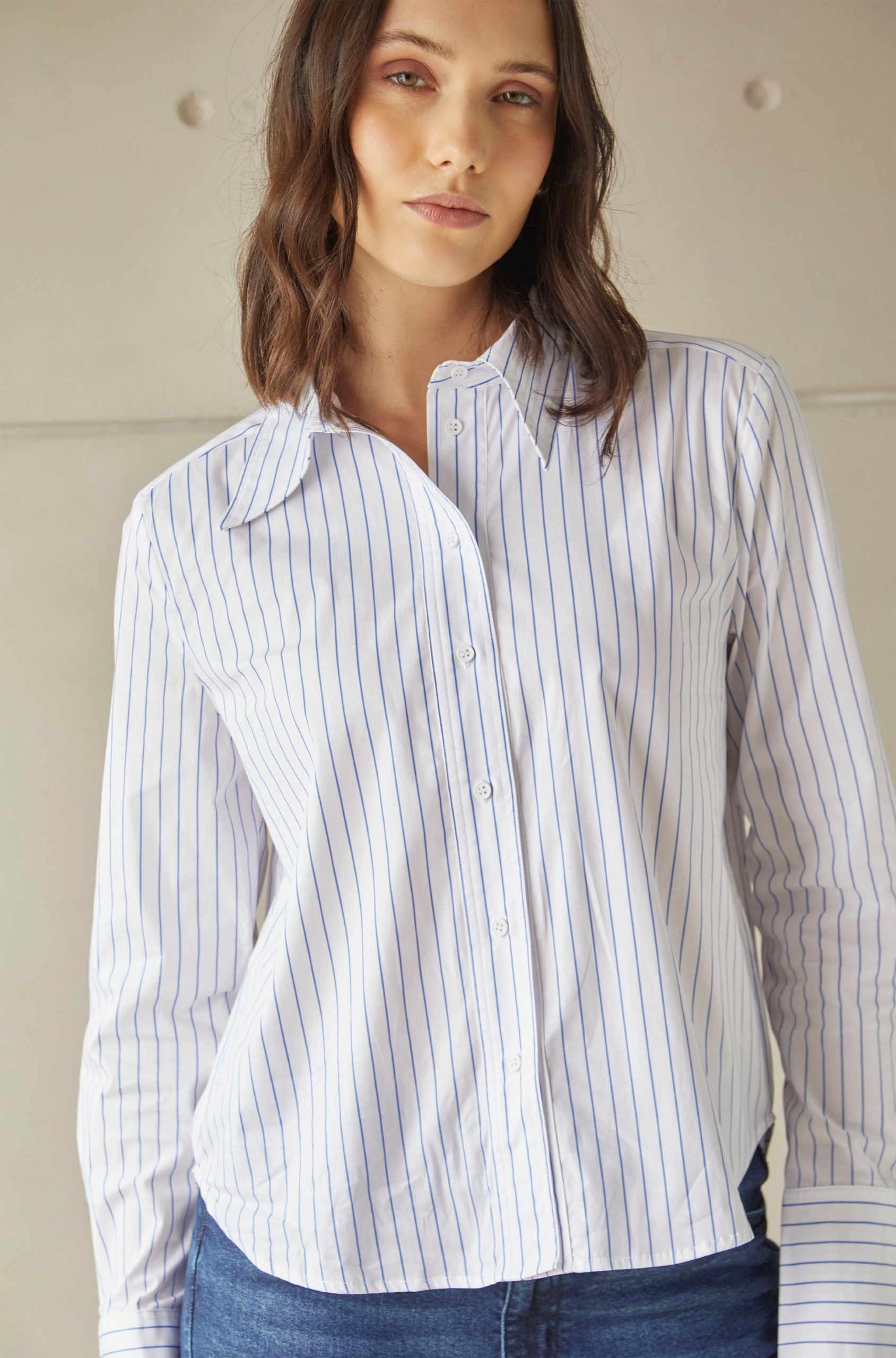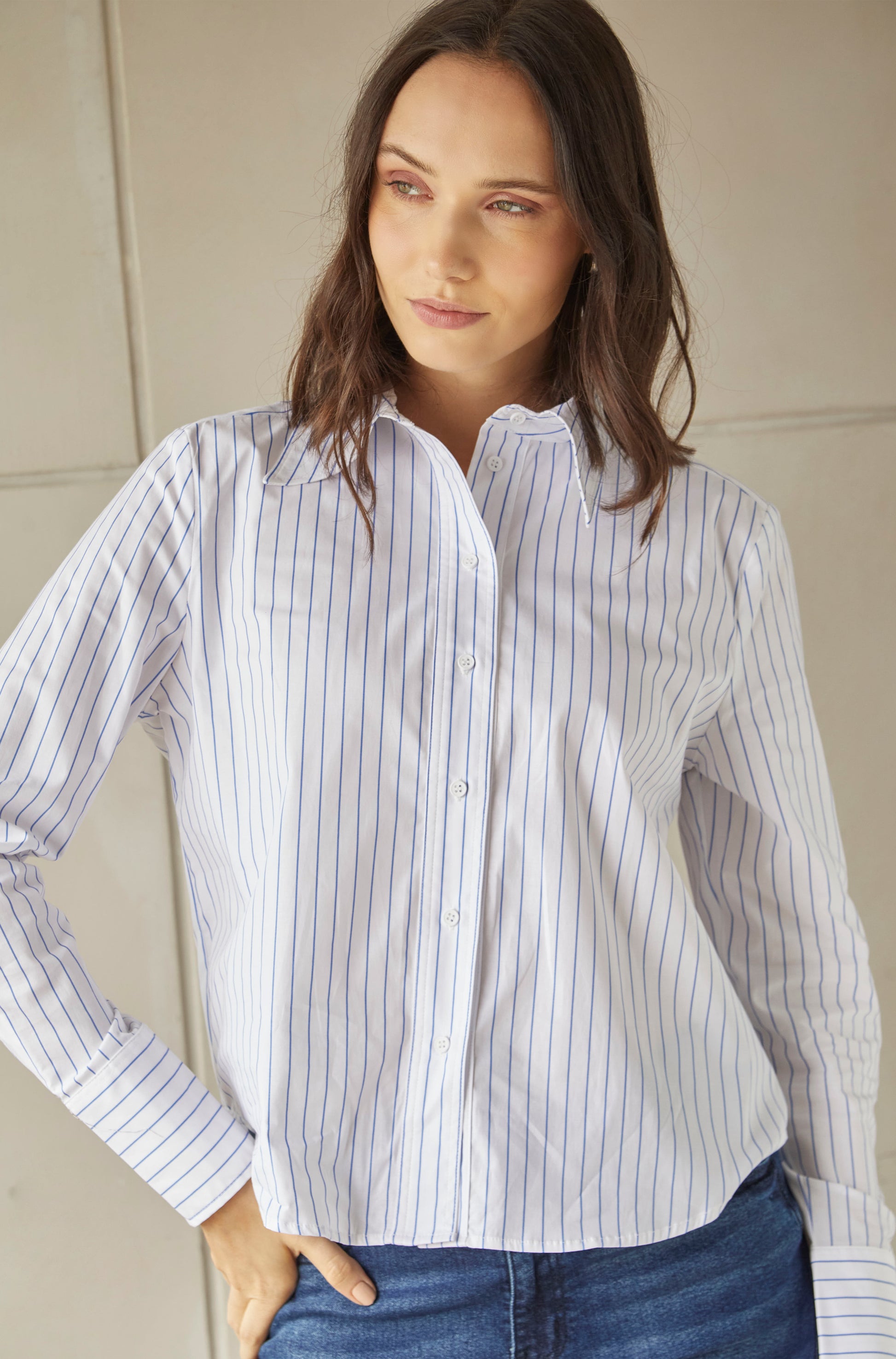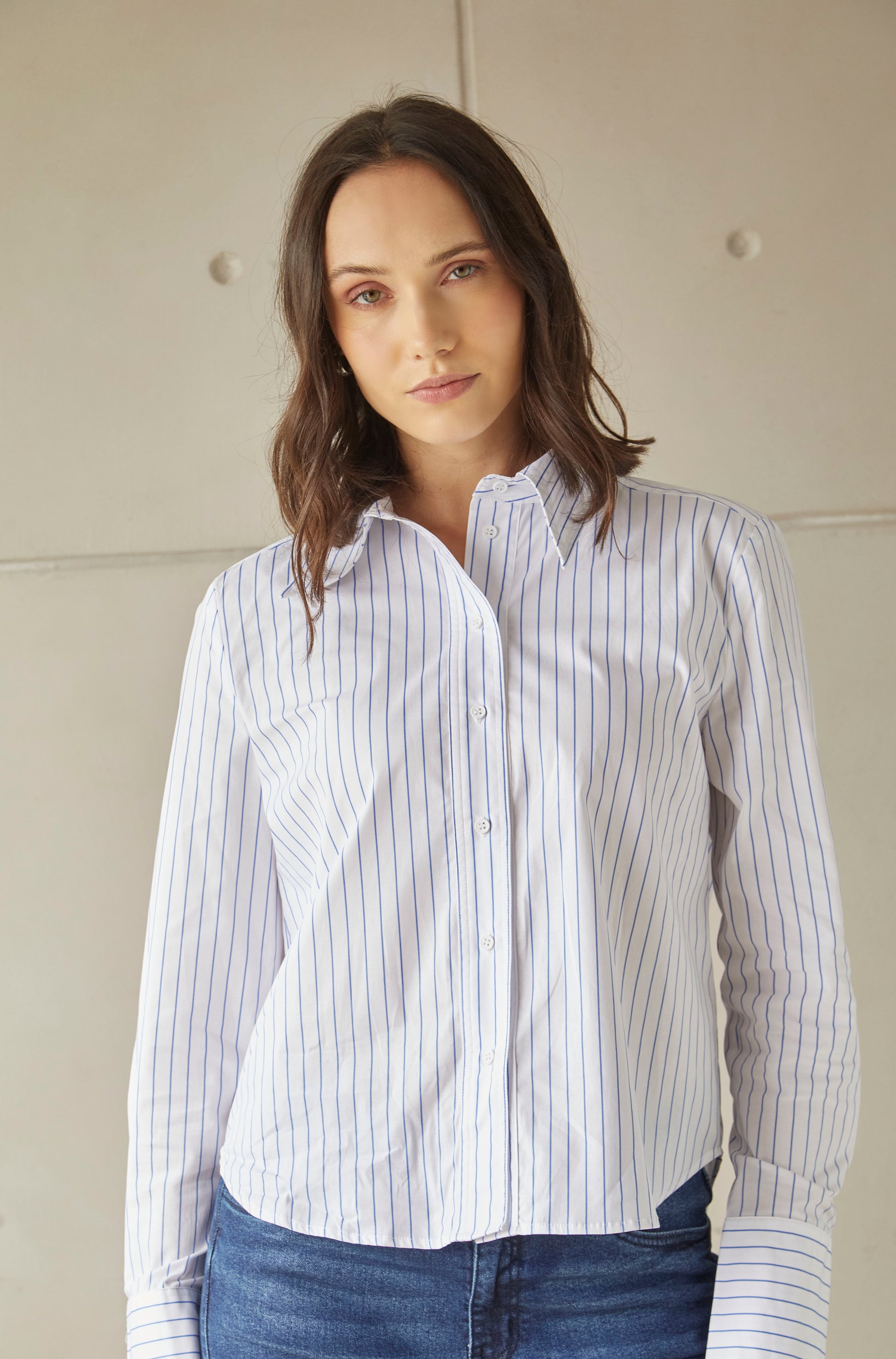 Blusa básica de cuello y solapa sin bolsillos. Tela: Popelina licrada. Composición: 98% Algodón, 2% Spandex. Medidas: Contorno de pecho: Small: 105 cm – Medium: 109 cm. Contorno de cintura: Small: 106 cm – Medium: 110 cm. Lago: Small: 61 cm – Medium: 62 cm.