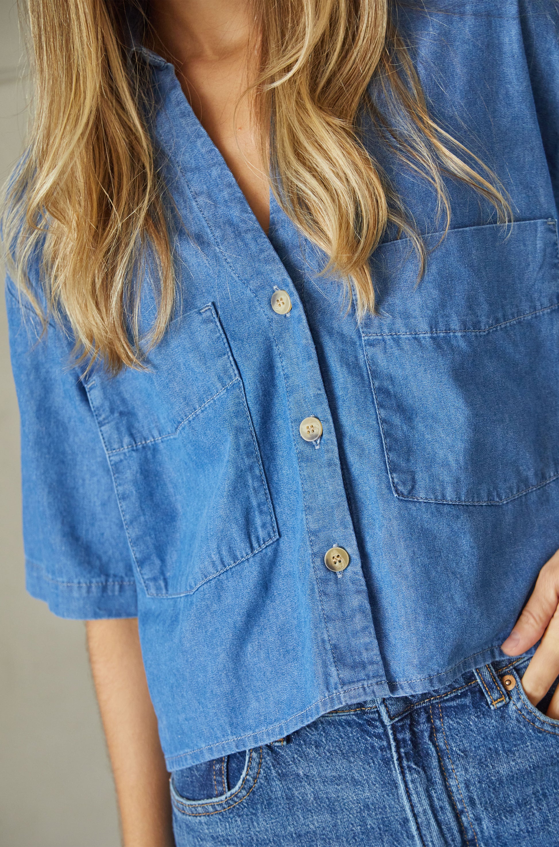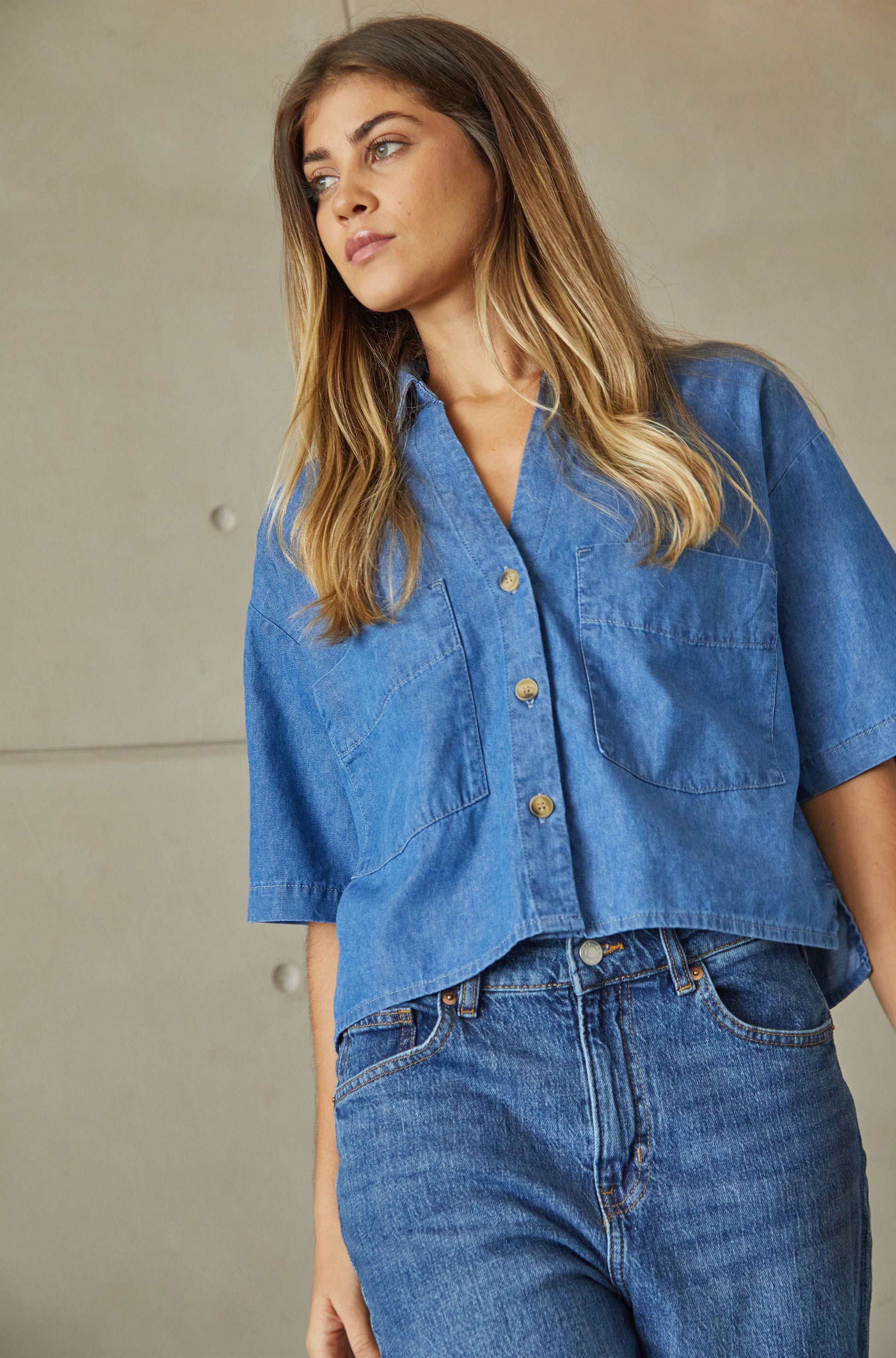Blusa crop de cuello y solapa escote V y manga corta. Tela: Denim rígido. Composición: 100% Algodón. Medidas: