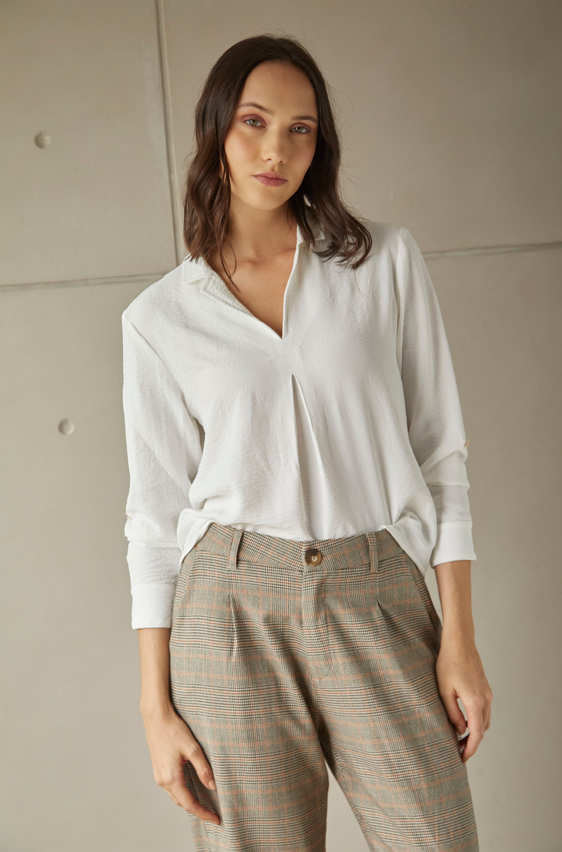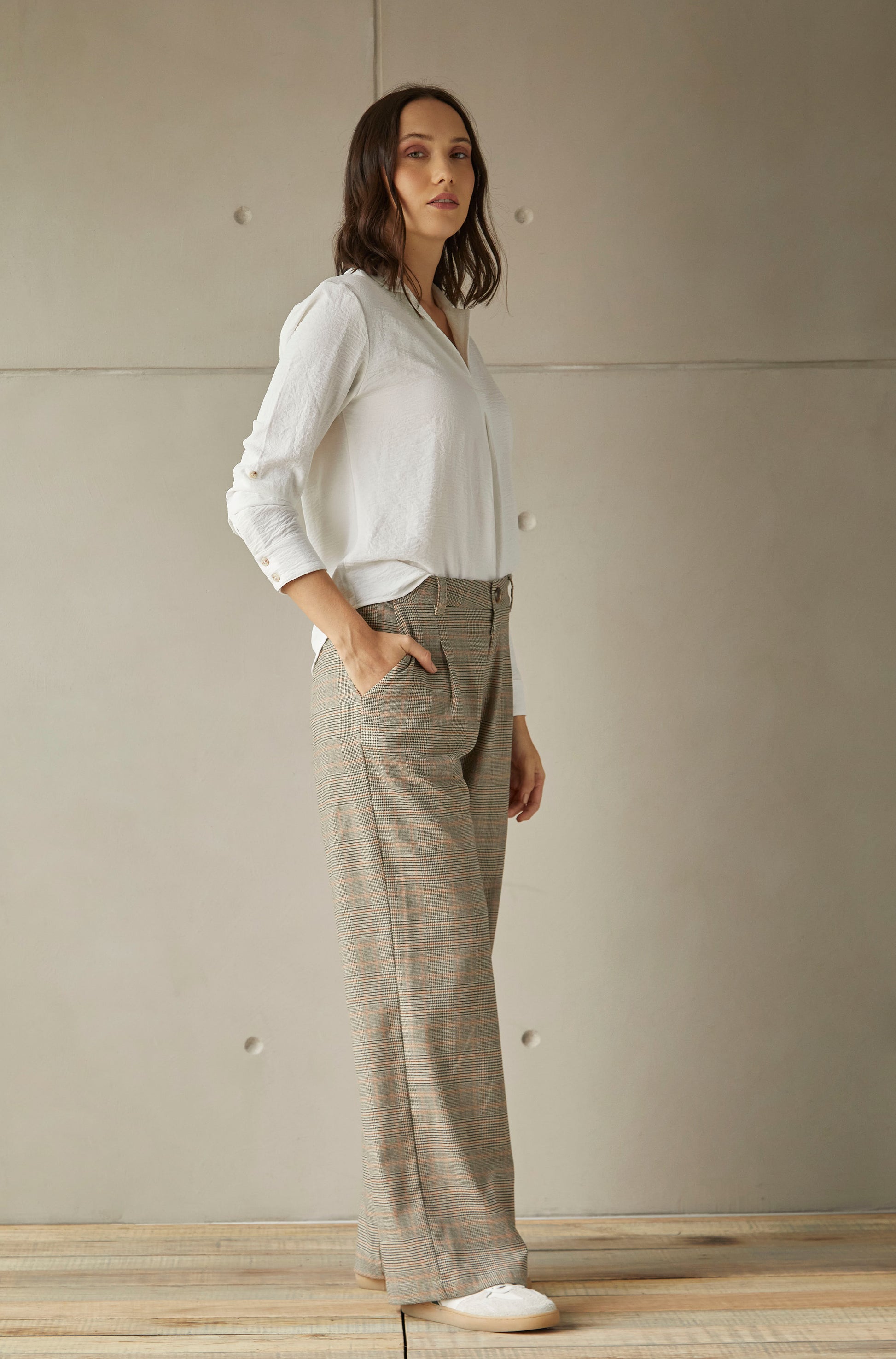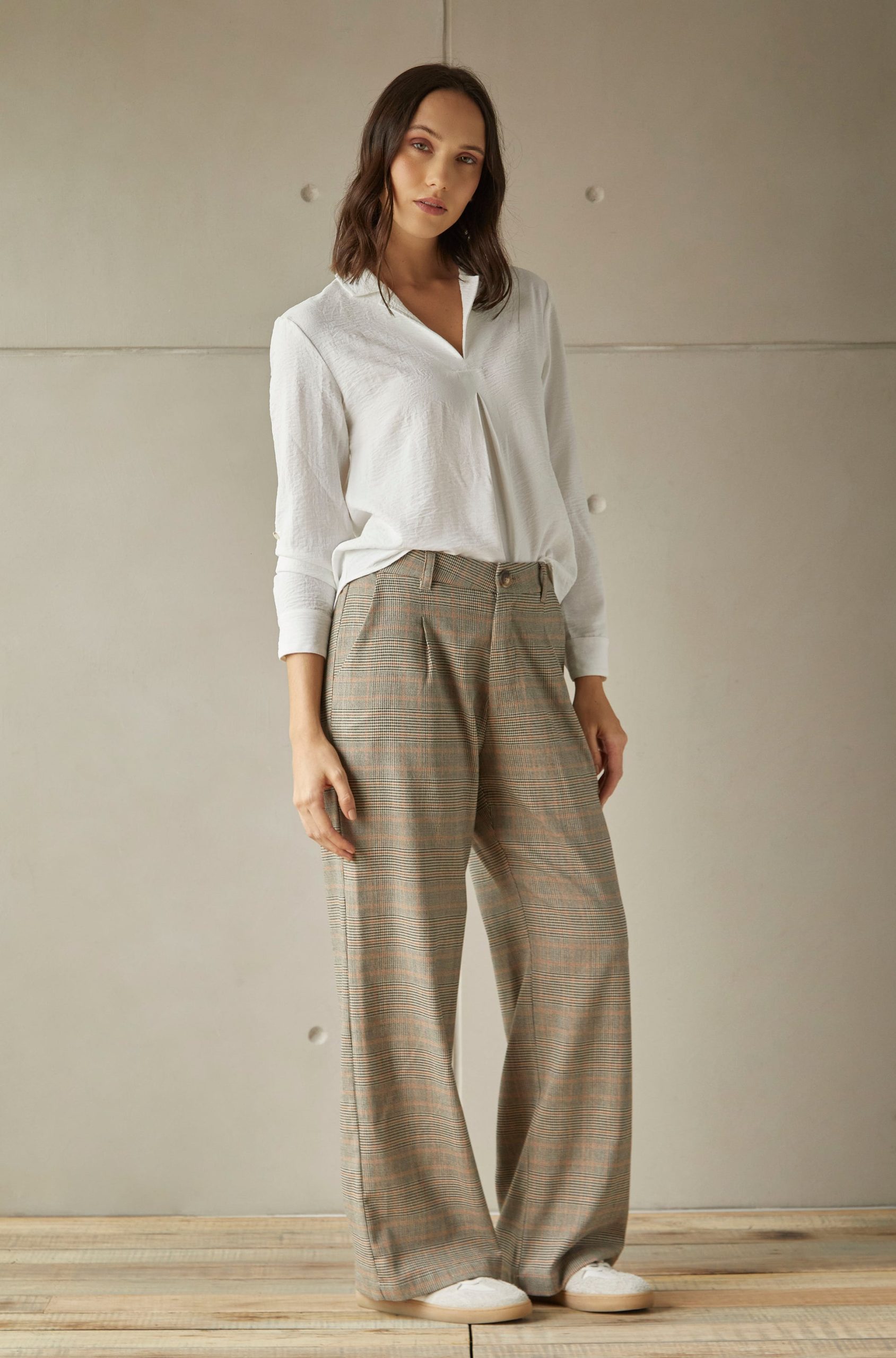 Pantalón wide leg con pinzas y elasticado en cintura.